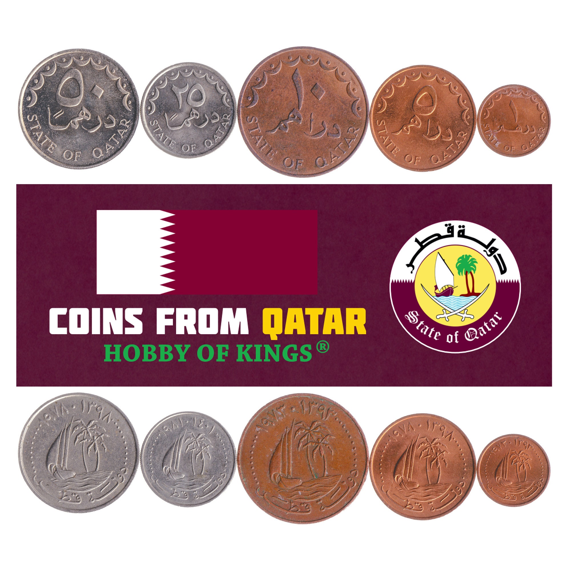 Qatari 5 Coin Set 1 5 10 25 50 Dirhams | Palm Trees | Sailing Ship - Dhow | 1972 - 1998