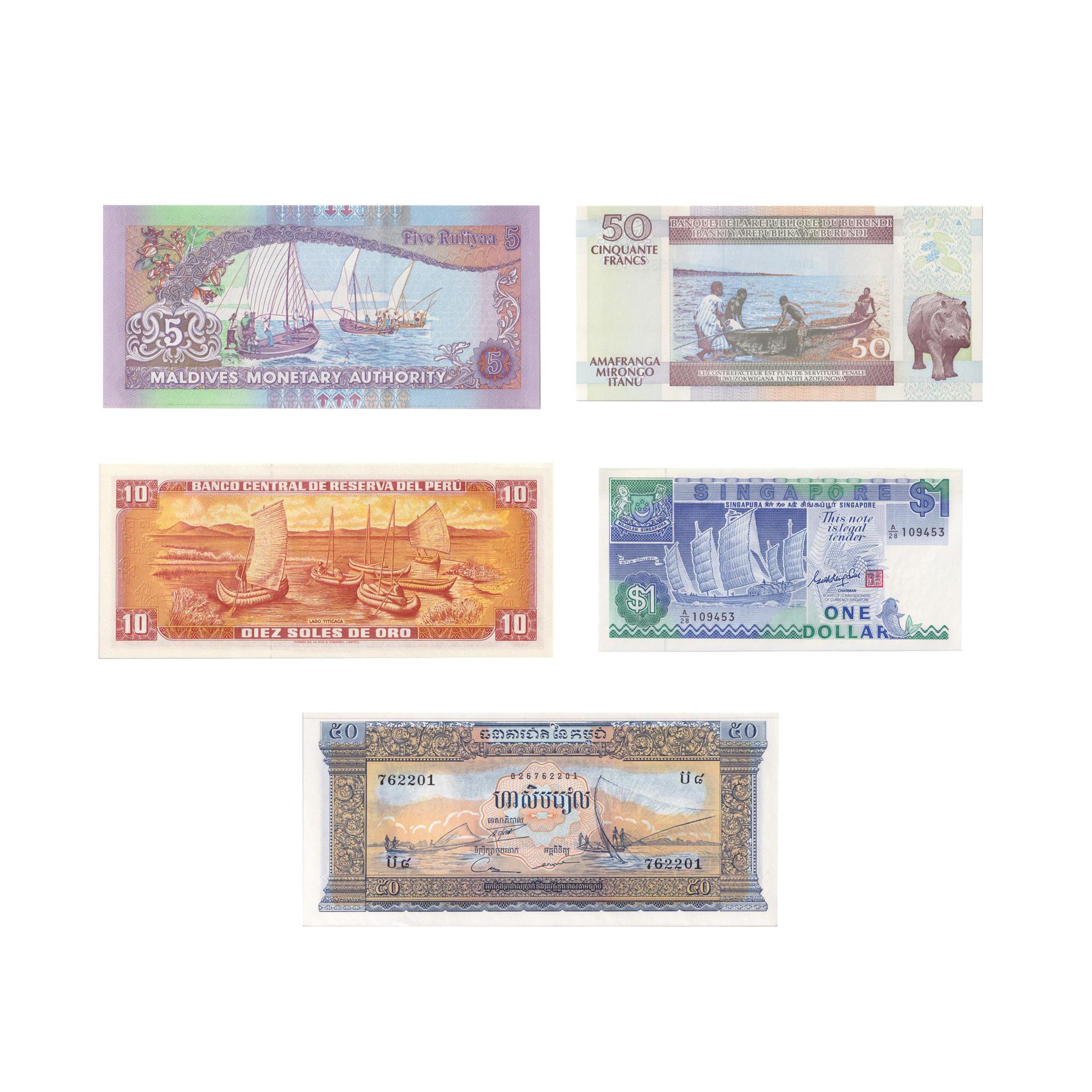 5 Banknote Set | Ships | Sha Chuan | Canoe | Dhow Sailing Ship | Reed Boats | Fishnet Fishing
