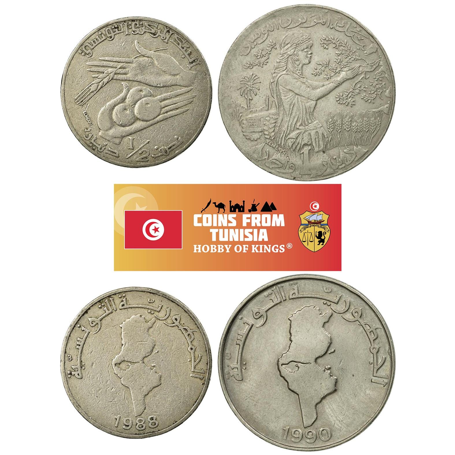 2 coin set made in Tunisia (al-Jumhūrīyah at-Tūnisīyah ), الجمهورية التونسية. Tunisian coins picked from these periods: Dinar (1988 - 1990).