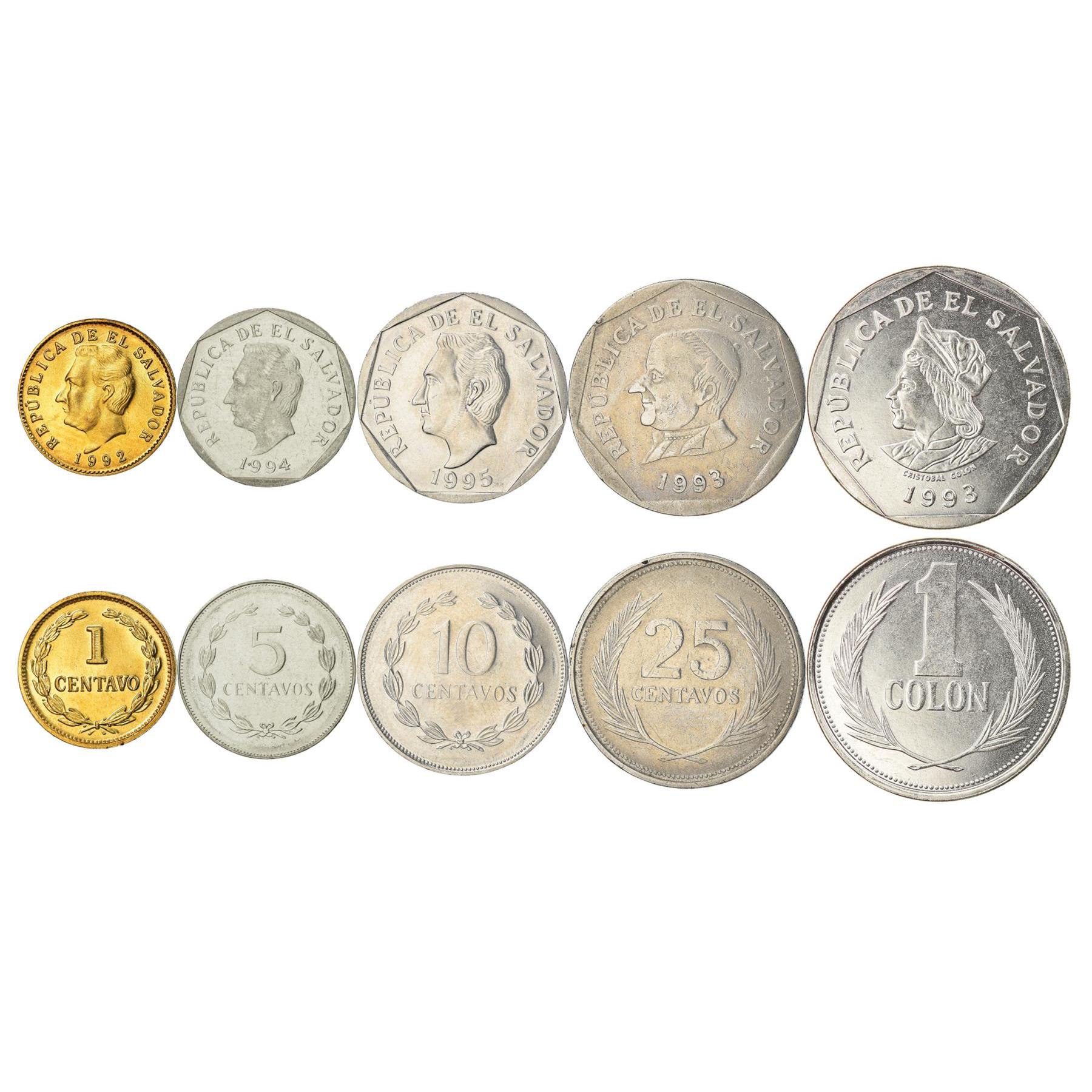 5 coin set made in El Salvador (Republic of El Salvador ), República de El Salvador. Salvadoran coins picked from these periods: Colón (1989 - 1999).