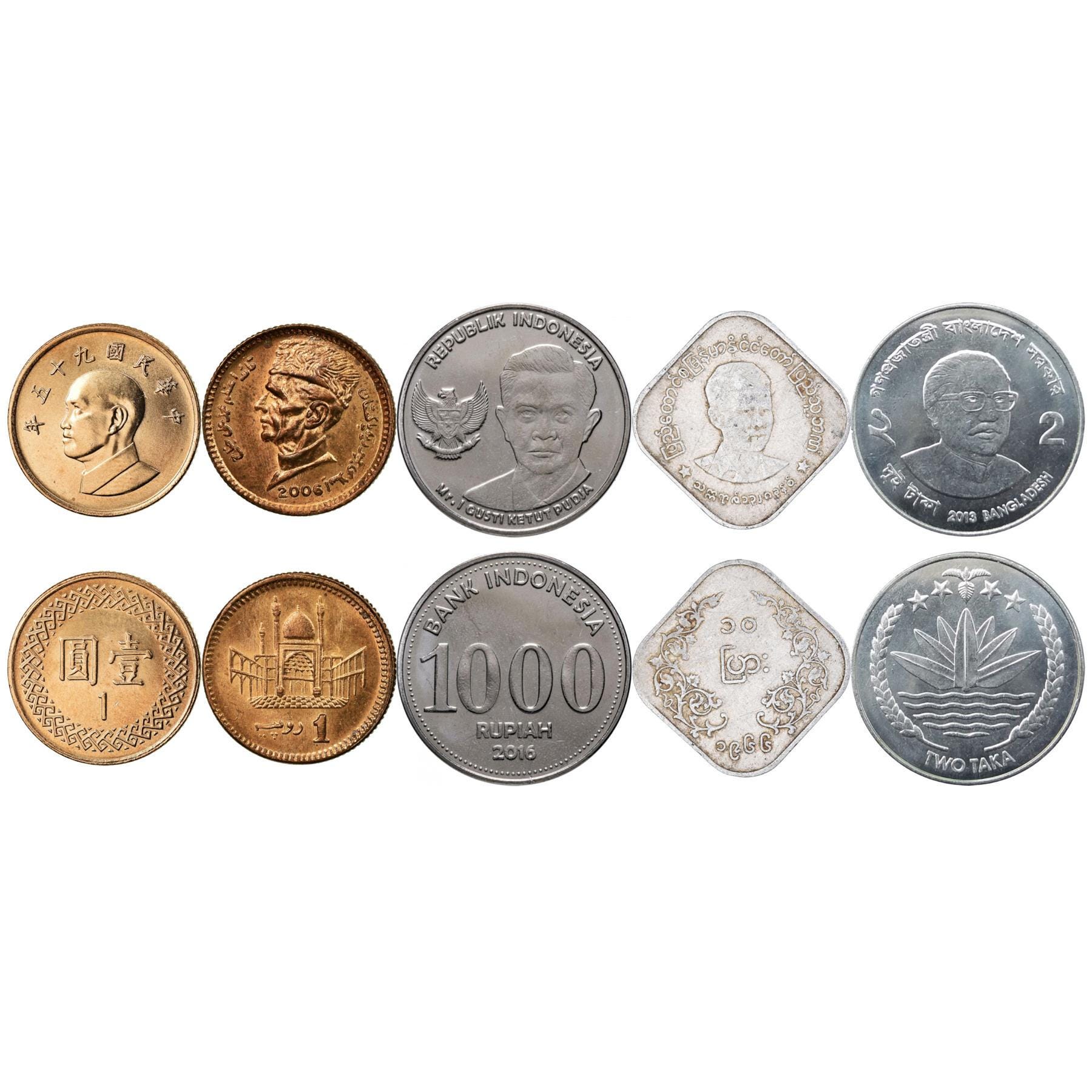 5 coin set made in these countries: Taiwan, Pakistan, Indonesia, Myanmar, Bangladesh (Republic of China, Islamic Republic of Pakistan, Republic of Indonesia, Republic of the Union of Myanmar, People's Republic of Bangladesh ), 中華民國, اِسلامی جمہوریہ پاكِستان, Republik Indonesia, ပြည်ထောင်စု သမ္မတ မြန်မာနိုင်ငံတော်, গণপ্রজাতন্ত্রী বাংলাদেশ.