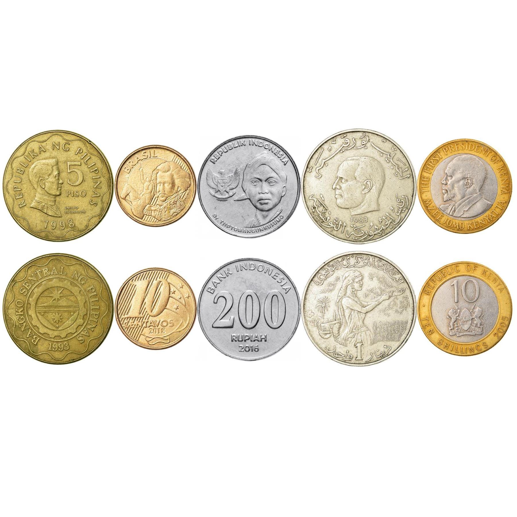 5 coin set made in these countries: Philippines, Brazil, Indonesia, Tunisia, Kenya (Republic of the Philippines, Federative Republic of Brazil, Republic of Indonesia, al-Jumhūrīyah at-Tūnisīyah, Republic of Kenya ), Republika ng Pilipinas, República Federativa do Brasil, Republik Indonesia, الجمهورية التونسية, República Argentina.