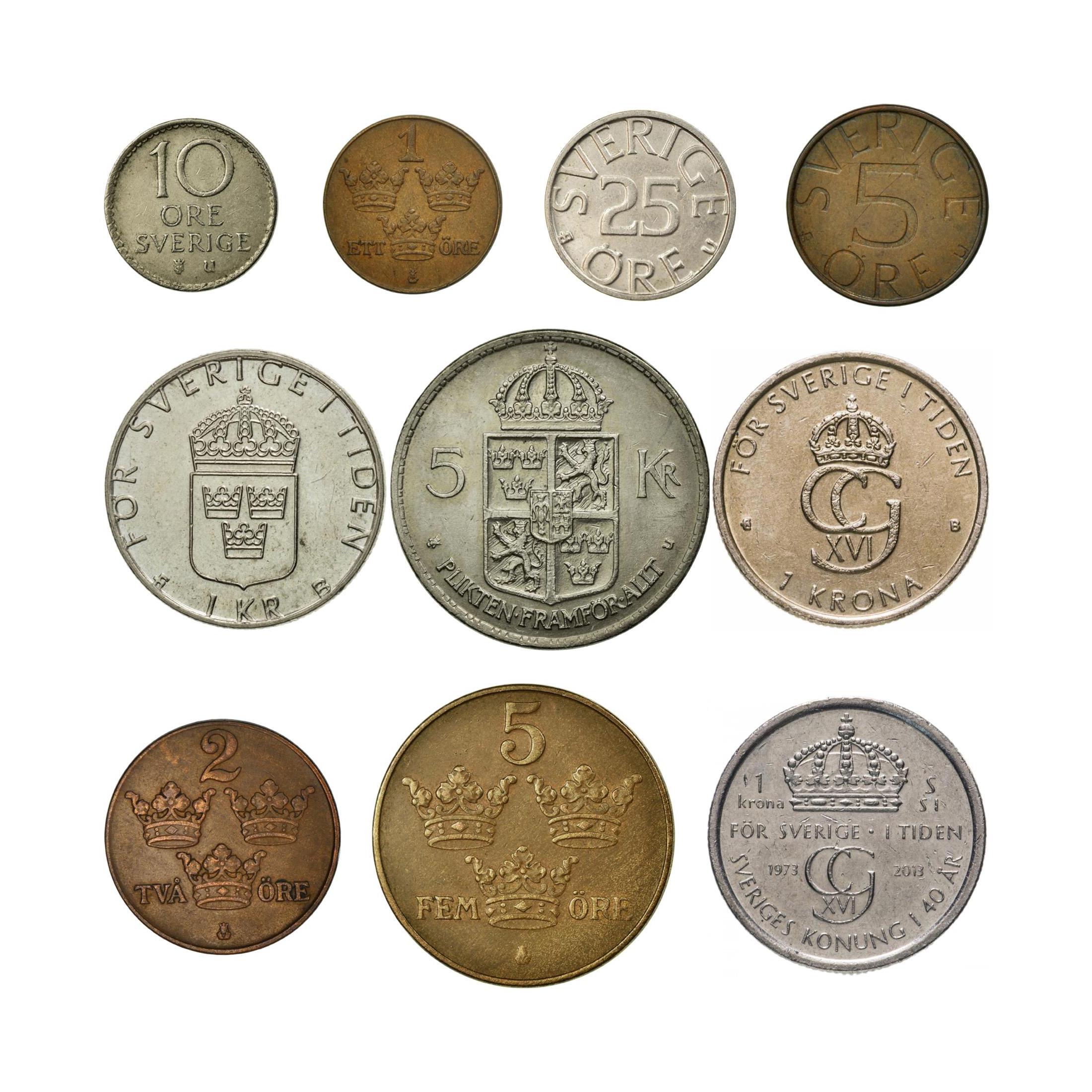 10 coin set made in Sweden (Kingdom of Sweden ), Konungariket Sverige. Swedish coins picked from these periods: (1909 - 2013).