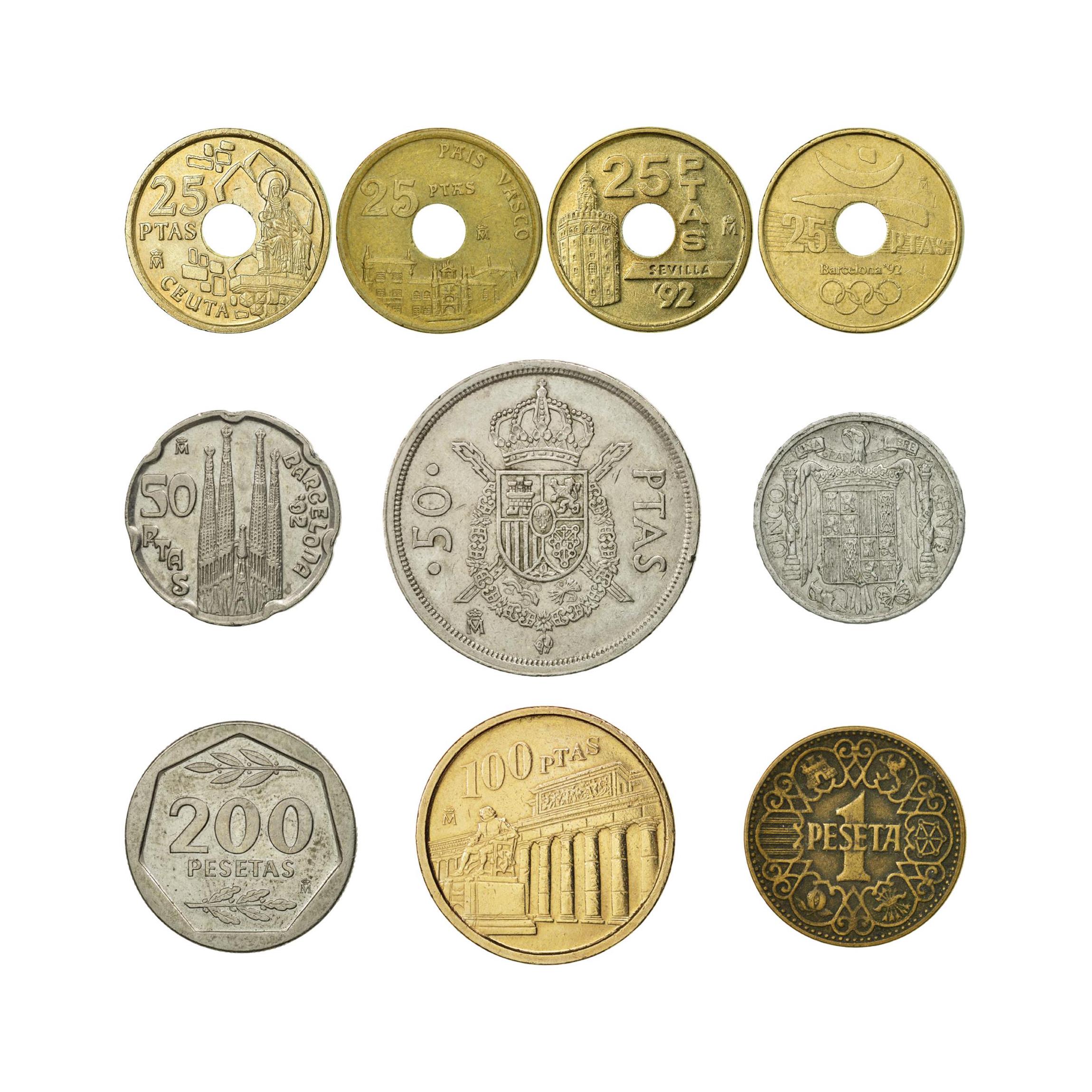 10 coin set made in Spain (Kingdom of Spain ), Reino de España. Spanish coins picked from these periods: Peseta (1940 - 1994).