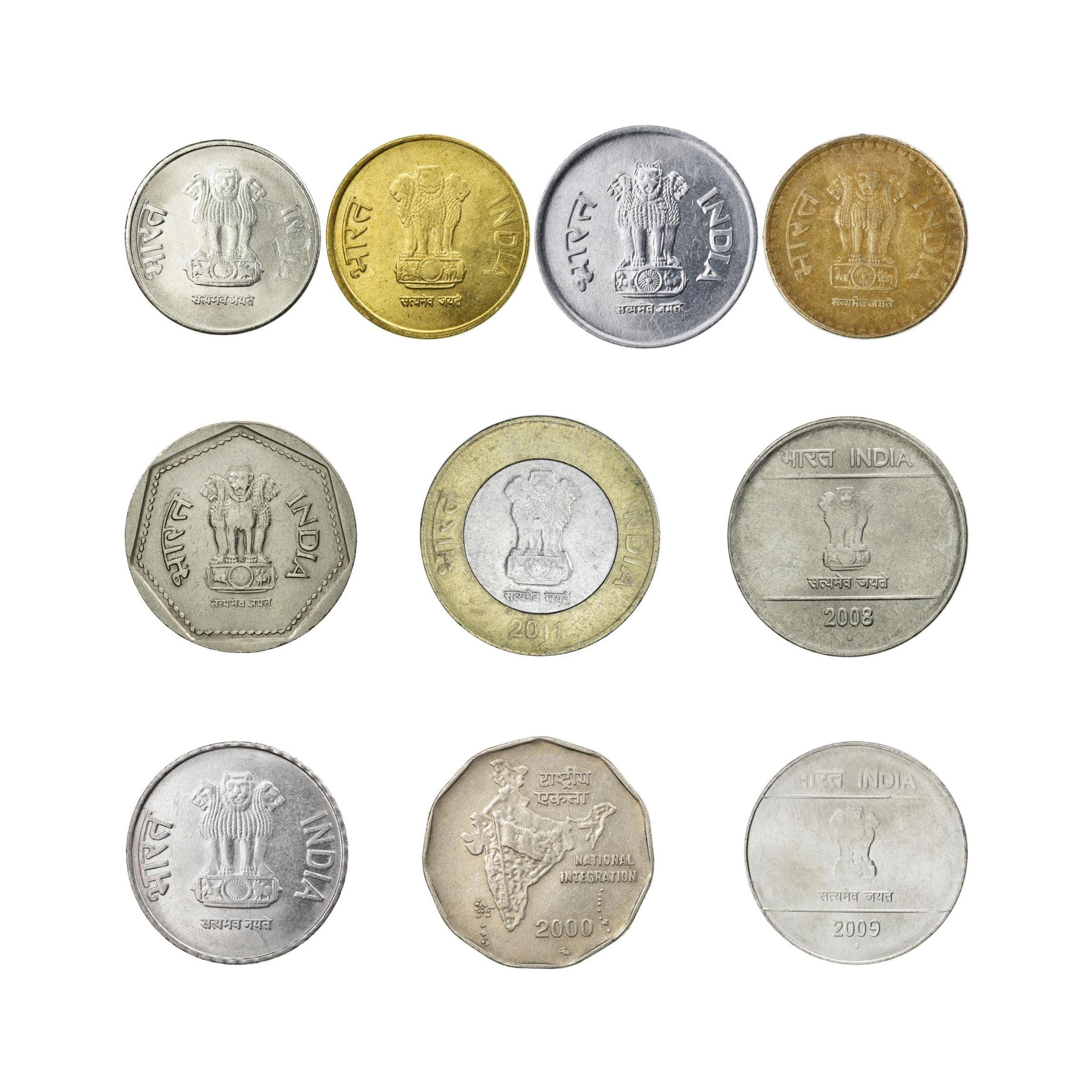 10 coin set made in India (Republic of India ), Bhārat Gaṇarājya. Indian coins picked from these periods: Rupee (1983 - 2019).