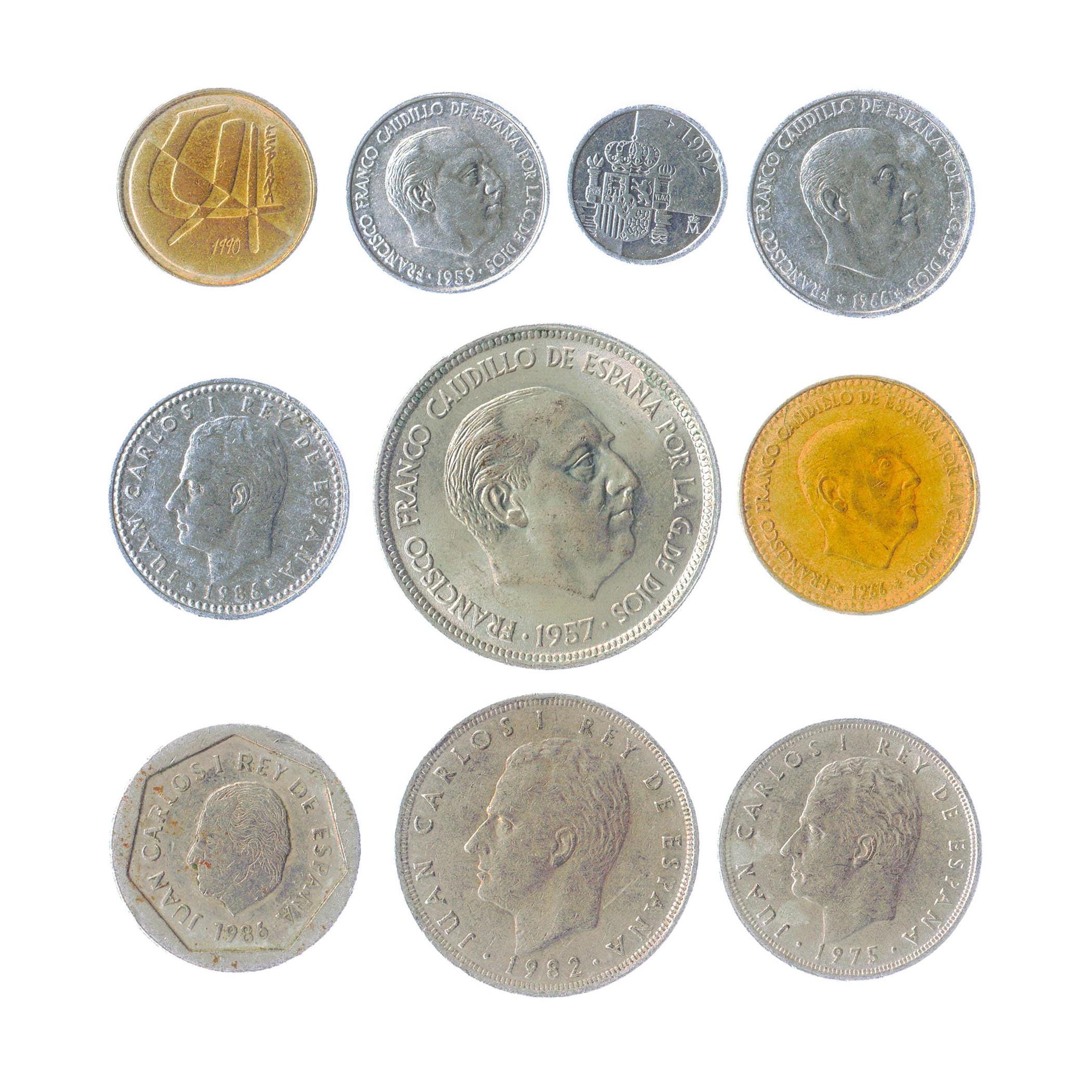 10 DIFFERENT COINS FROM THE KINGDOM OF SPAIN. Old collectible coins picked before Euro from these numismatic periods: King Juan Carlos I (1975-2001) and Dictator Francisco Franco (1940-1975). Each bag may have different combinations of coins. You may receive Spanish coins from 10 centimos to 100 pesetas. Spanish coins have portraits of dictators Francisco Franco and Juan Carlos I and many other symbols: Cogwheels, anchors and helms or even sailboats. All coins have a coat of arms: the eagle of Saint John.
