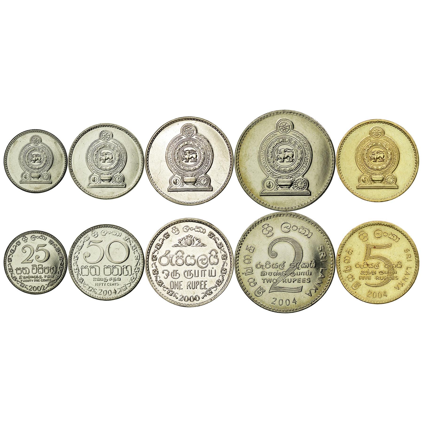 Sri Lanka Coin Set: 25, 50 Cents, 1, 2, 5 Rupees (1996-2004)