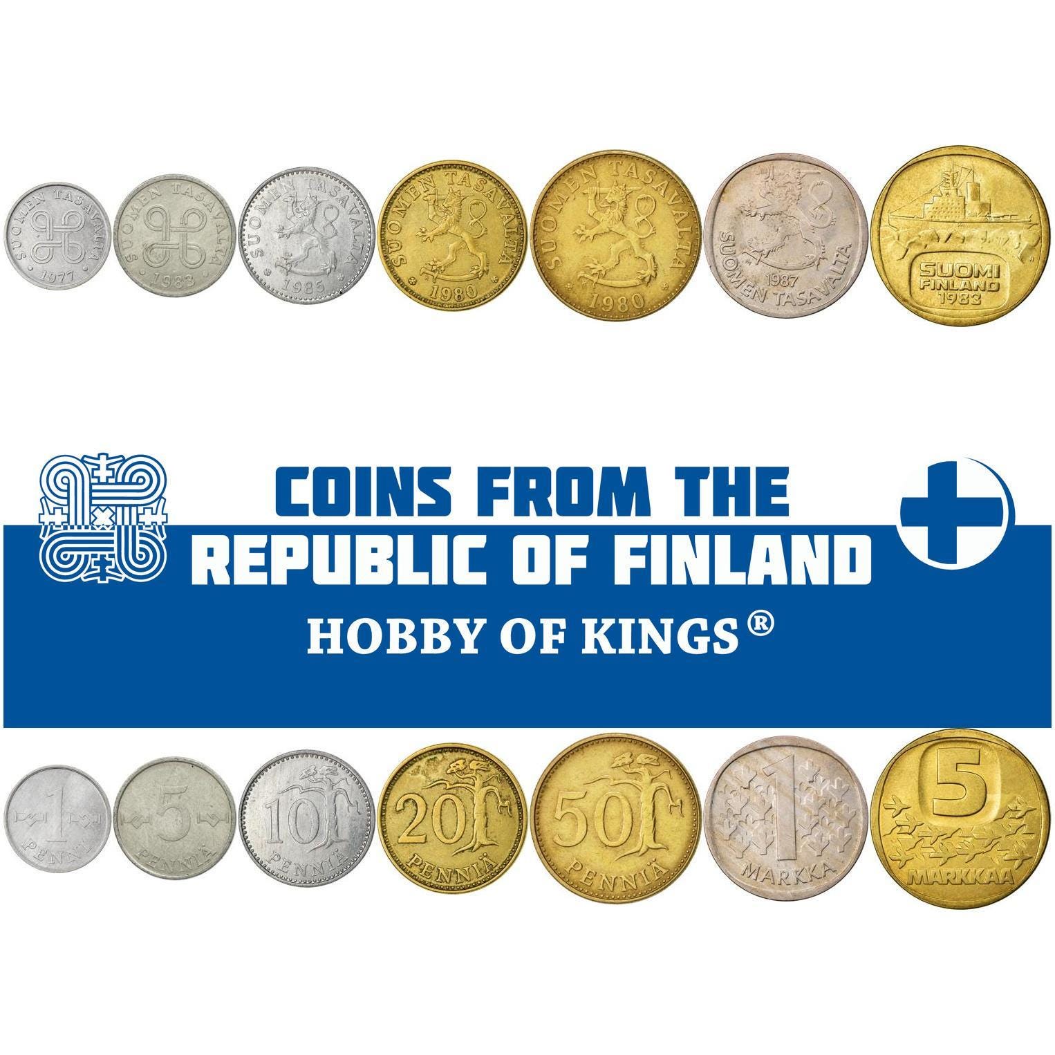 The product will have these denominations: 1, 5, 10, 20, 50 Penniä, 1, 5 Markkaa. Some of the coins may be changed with a similar catalog numbers. Some of the coins may be changed with a similar catalog number. A full list of catalog numbers: 44a, 45a, 46a, 47, 48, 49a, 57.