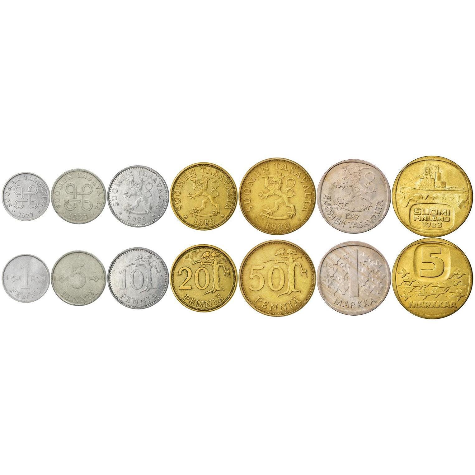 Finnish 7 Coin Set 1 5 10 20 50 Penniä 1 5 Markkaa | Tree | Icebreaker | Saint Hannes Cross | Finland | 1977 - 1993