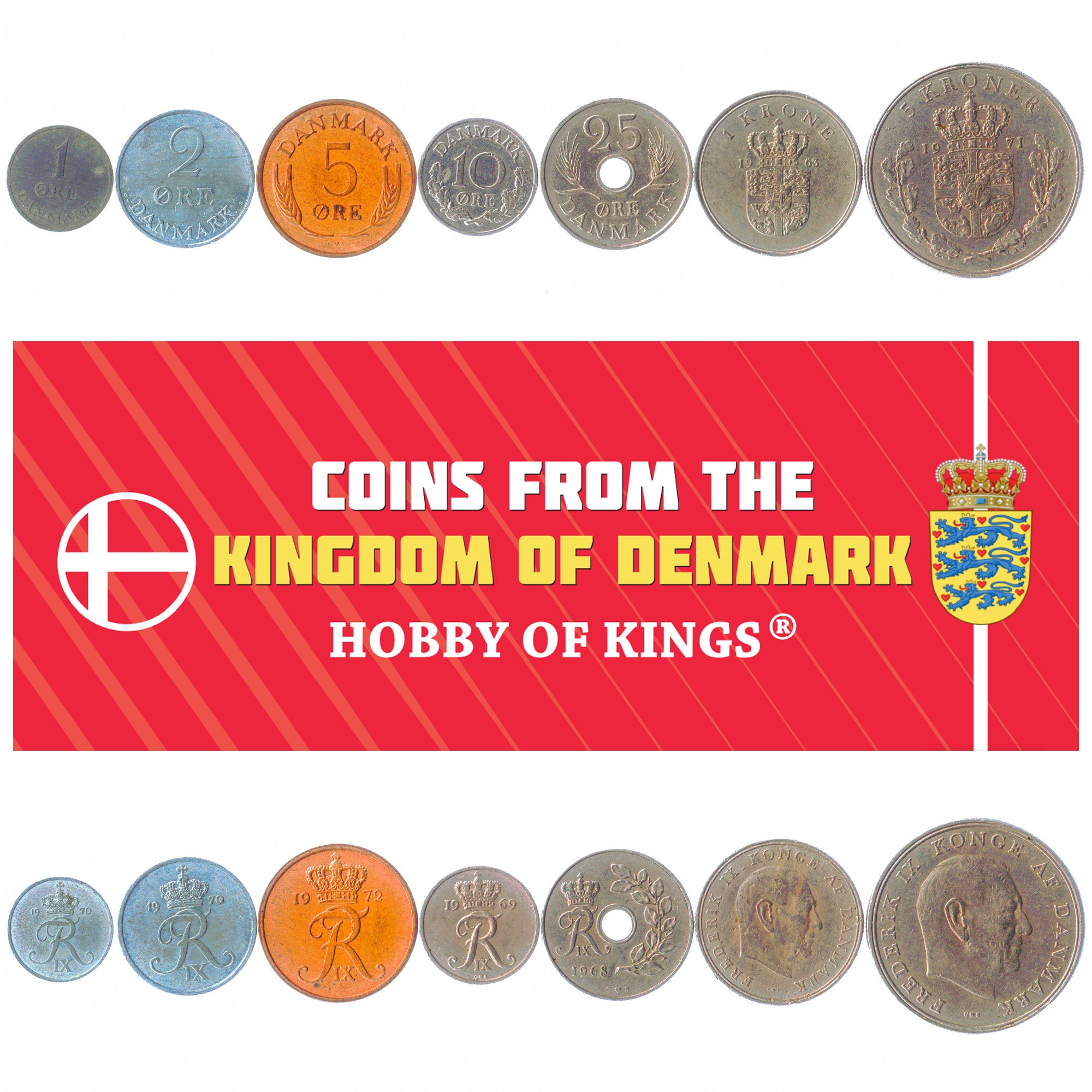 A set of 7 coins from Denmark (Kongeriget Danmark, Kingdom of Denmark). Different Danish coins picked from these periods: (1960 - 1972).