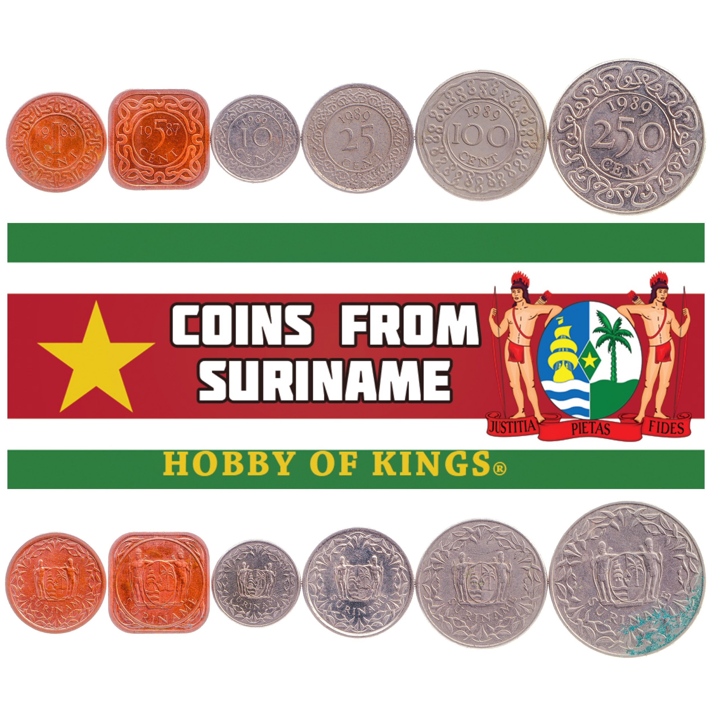 SET OF 6 COINS FROM SURINAME: 1, 5, 10, 25, 100, 250 CENTS. Coins picked randomly from 1987-1989. Coins were circulated for many years, the condition, years may be different from the photos.